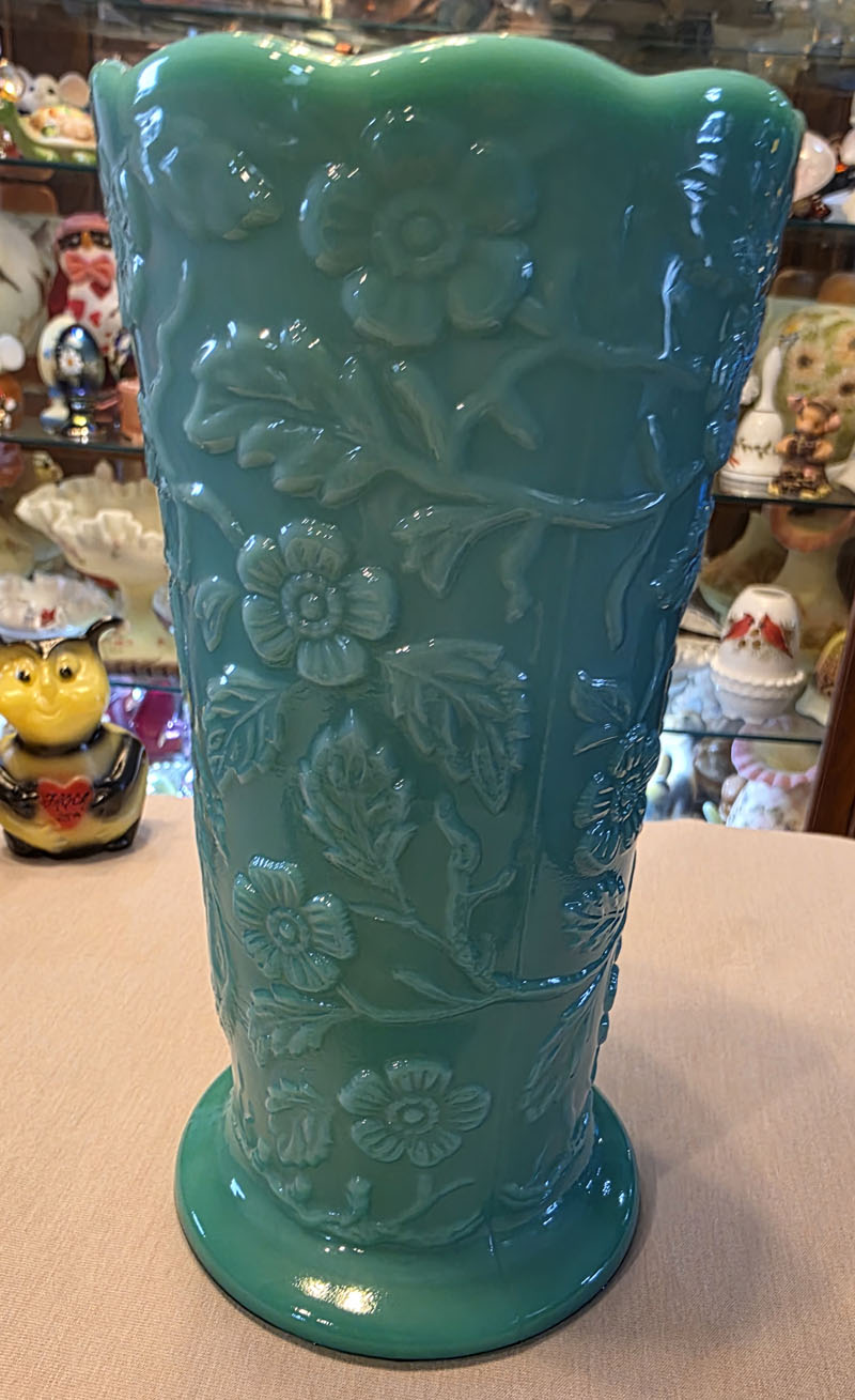 A rare piece of Fenton’s hand etched signature pieces. Made for the NFGS in 1991 with Sage Green for the color. WC was Bill Fenton. He only signed WC early in his career. This will make a great historic piece for your Fenton collection. Vase is in perfect condition and measures 8” tall x 4” wide.