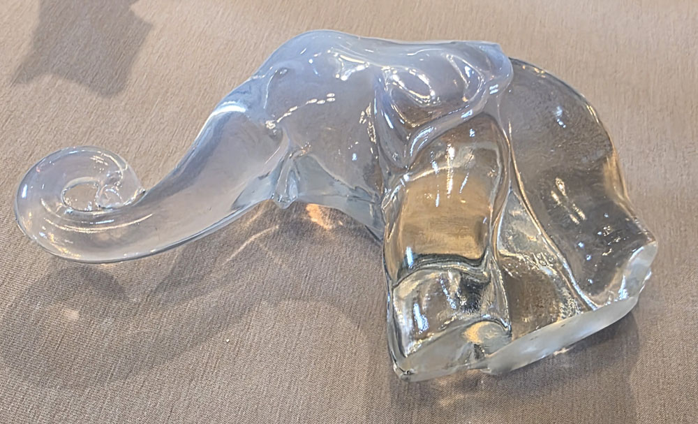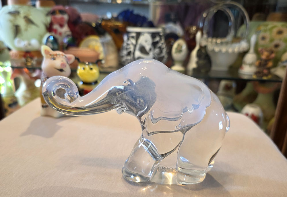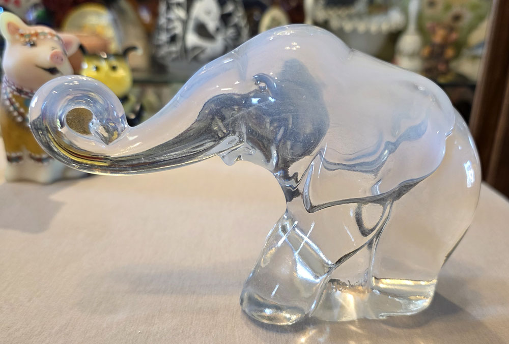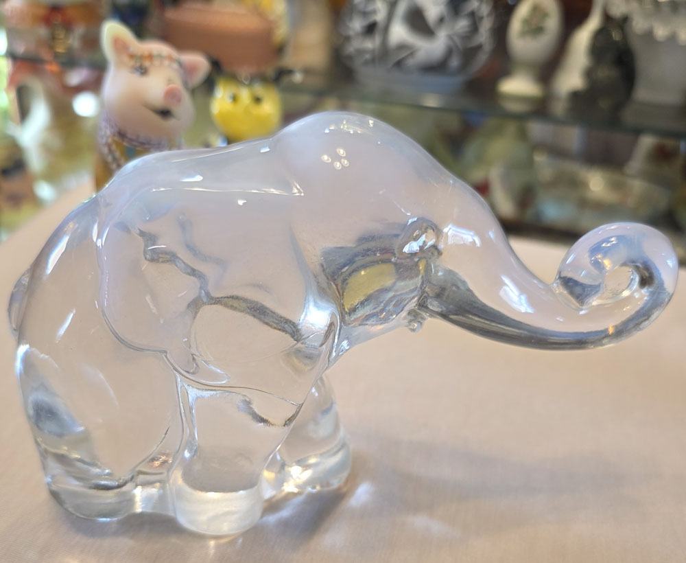 Elephant has a nice french opalescent look. Crystal clear and very heavy. Measures 7” long x 4” tall. Great condition with no problems in the glass. Check the pictures.