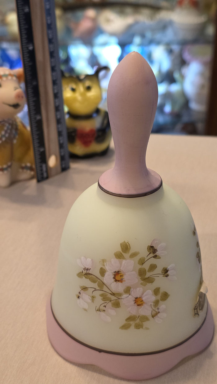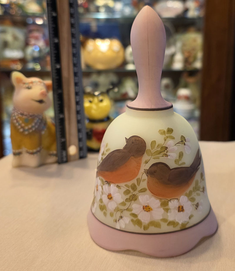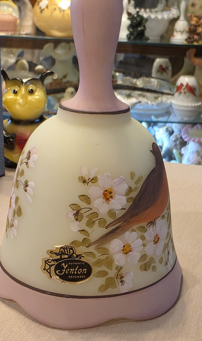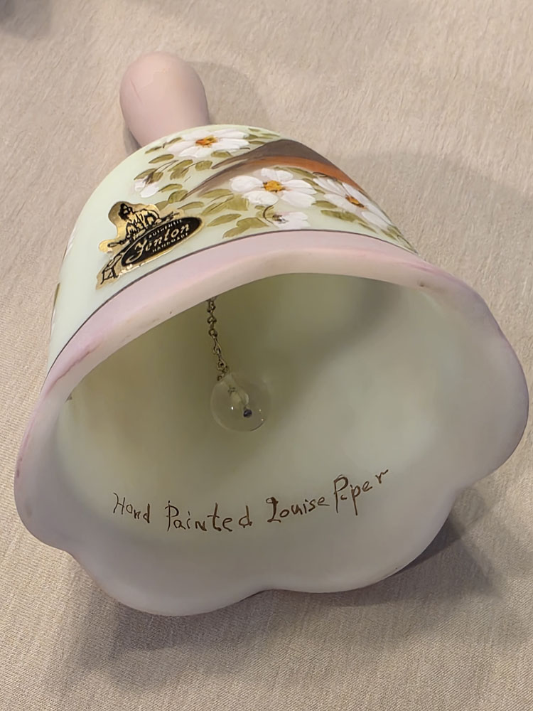 Fenton Louise Piper H/P - 6” Custard Bell An early Louise Piper hand painted this nice Custard glass Bell. Robins at play, adorn this great example of her work.