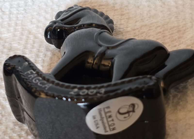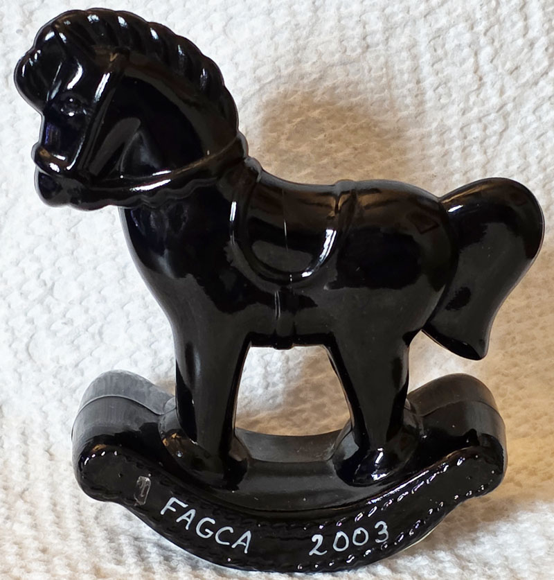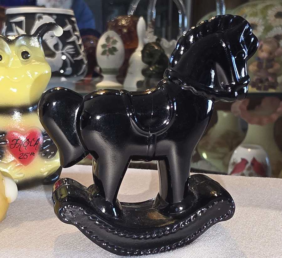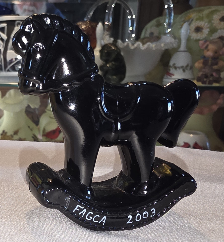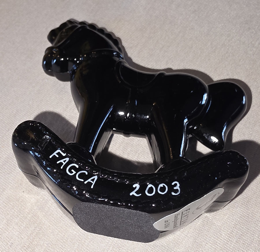 Cool black rocking horse from Fenton. Mint condition. Measures 3 1/4” tall x 2 ¾” long. Produced for FAGCA in 2003. Cute addition to your collection.
