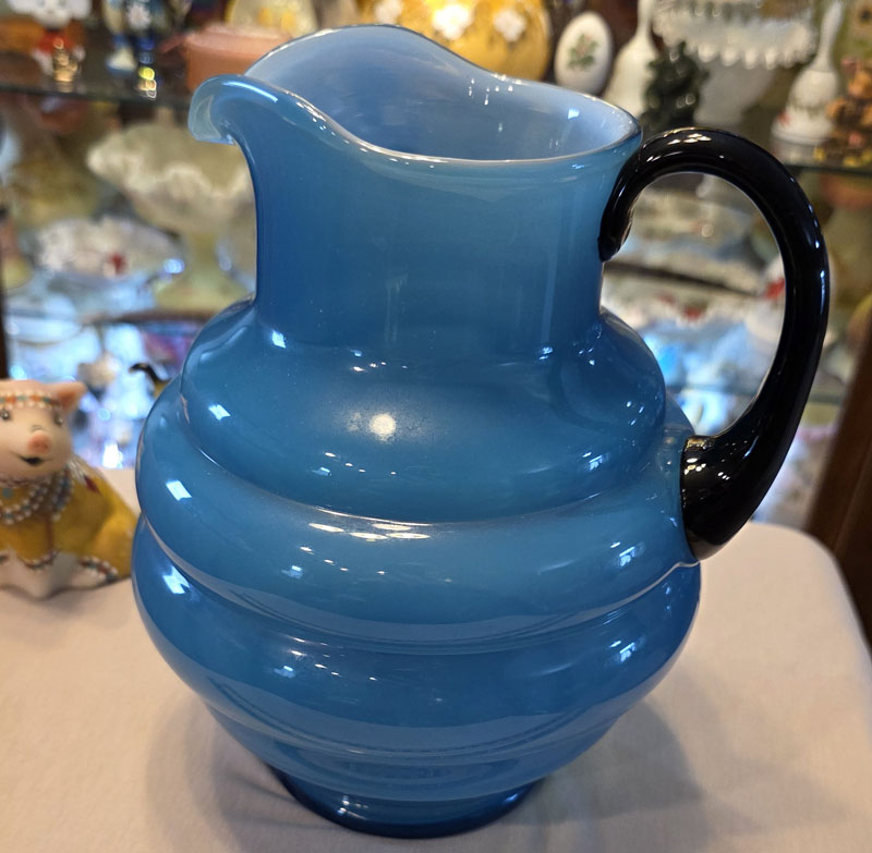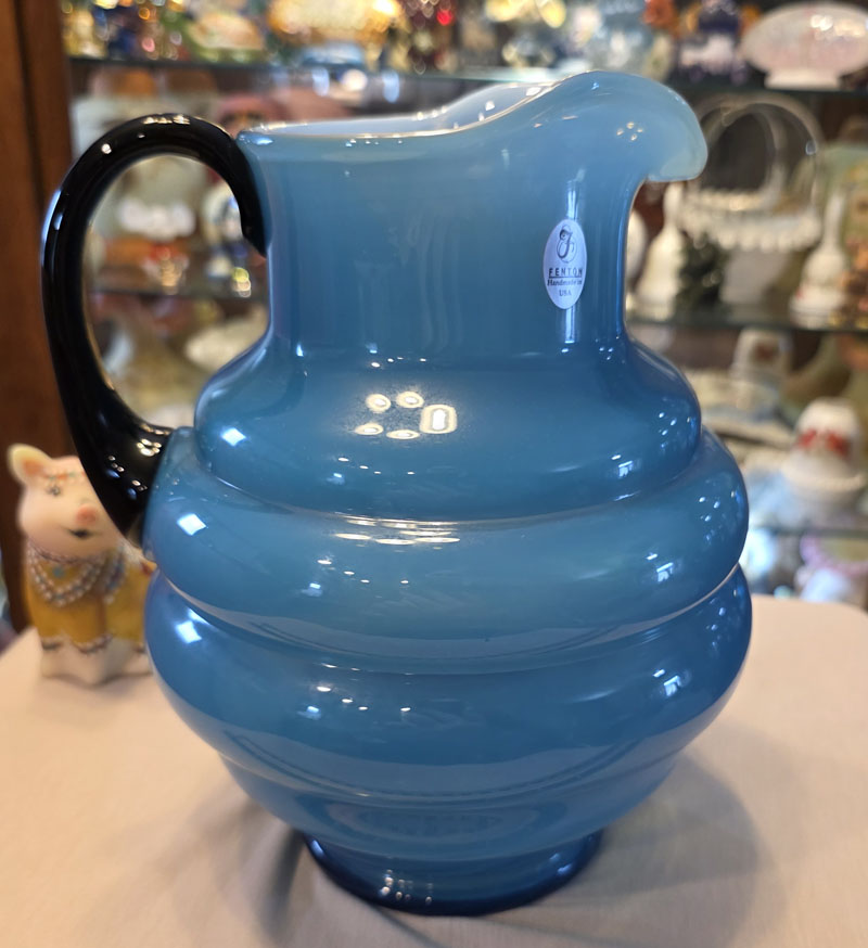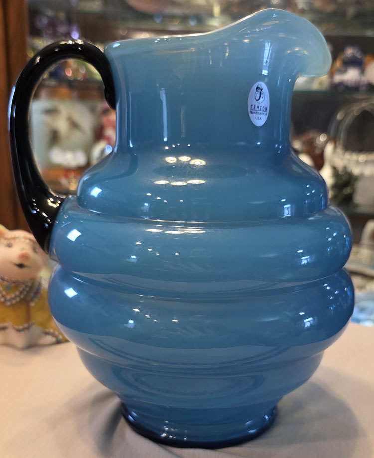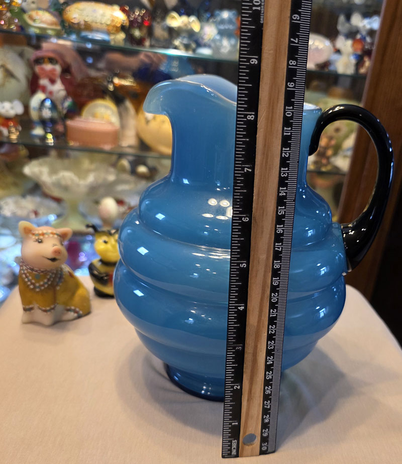 A grand size pitcher with a deco look. Indigo blue on the outside light milkglass on the inside. Check out the pictures for details. Only been displayed, Vintage perfect condition. Measures 8” tall x 6” wide. Great example of Fenton’s deco look.