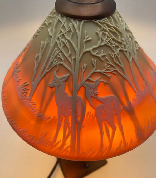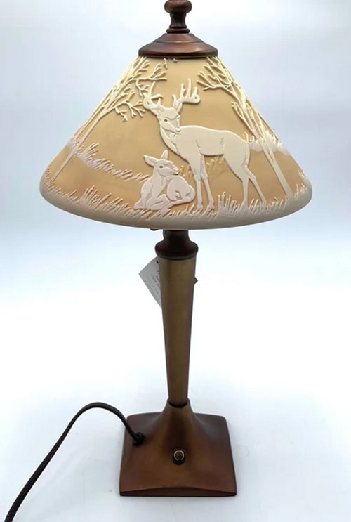 a gorgeous Fenton/Kelsey Murphy chocolate lamp called In the Glen! It is carved with deer and trees all the way around, and has trees carved on the inside to give a 3-D effect when lit. This amazing lamp was limited to only 250 made! Signed Kelsey/Bomkamp In the Glen. Lamp measures approximately 18 inches tall.