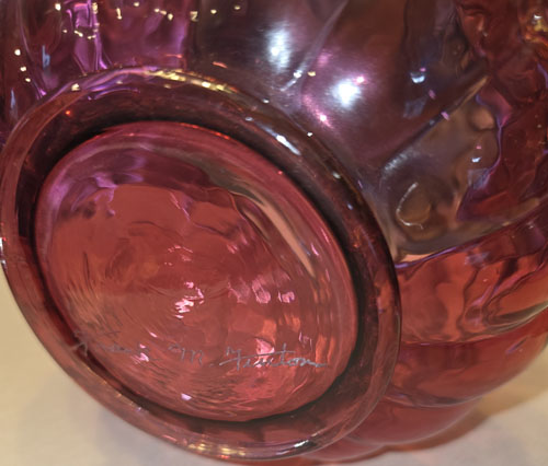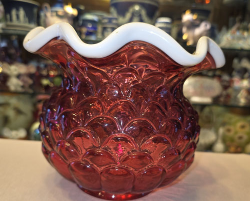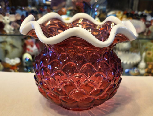 Fenton Cranberry Glass Jacqueline Pattern with White Milk Glass Ruffled Rim with original label plus has the Signature of Frank M. Fenton on the underside.