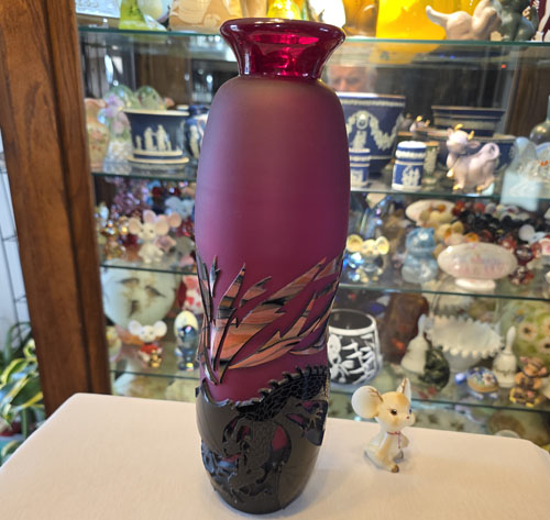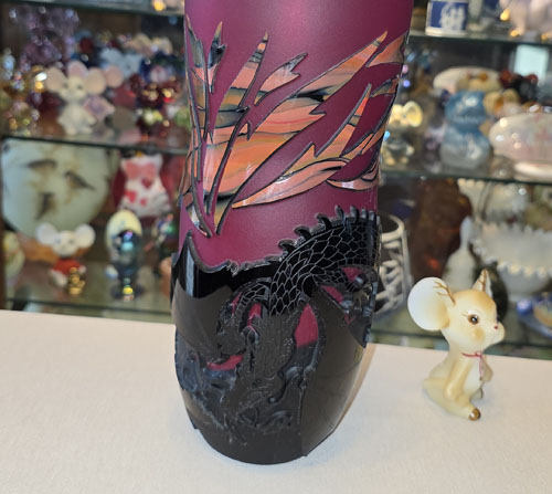 Fenton Cameo Fire In The Sky Vase. Made of ruby glass cased by black glass by Frank Workman. Features a carved dragon and castle, is designed and signed by Kelsey Murphy and Robert Bomkamp. Number 1/95 and measures 13" high and 3 3/4' in diameter. This is a very detailed piece and would great for any collection. Perfect condition with no chips or cracks.
