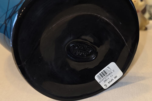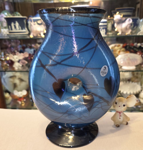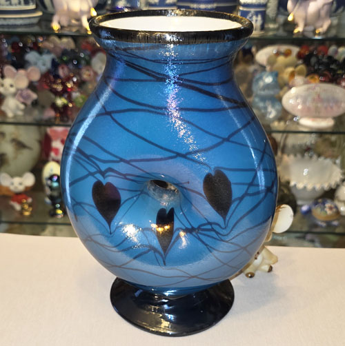 Fenton hanging hearts 9.75” donut hole vase in blue. Very heavy triple cased glass vase. One of the most popular patterns of Dave Fetty. Signed and dated by Dave Fetty